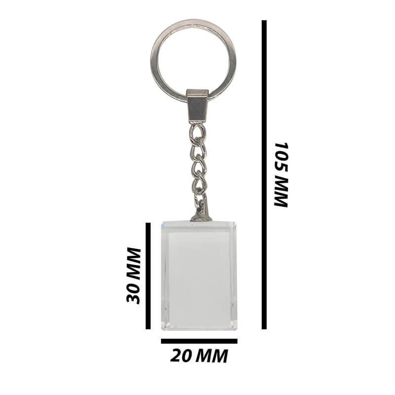 Crystal keyring rectangle is a glass keyring that can be sublimated at the back. By sublimating the keyring, it creates a “3D” effect as light shines through.