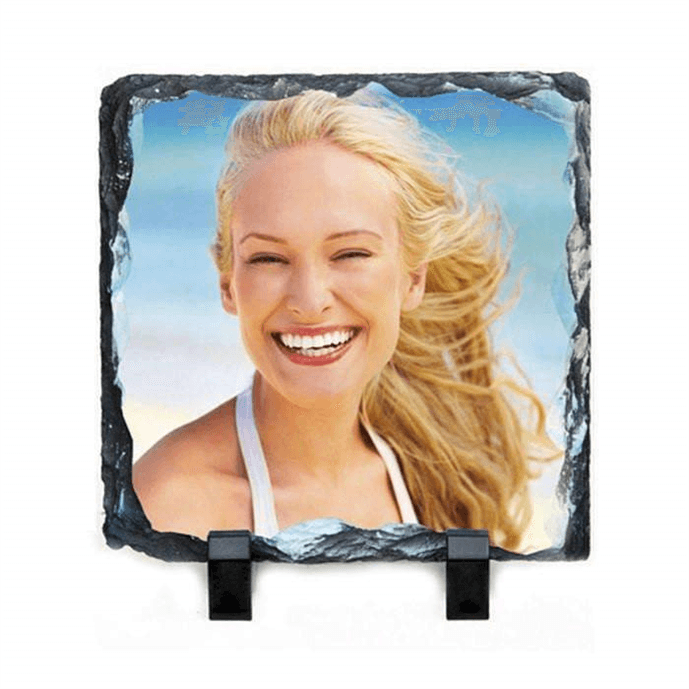 A Stone Photo display 150 x 150mm with a sublimation layer. The Phot display is perfect for cabinets, showcases, and office desks. The Stone photo displays are made from durable stone. Each Stone photo display comes with two stands to keep your photo display standing up